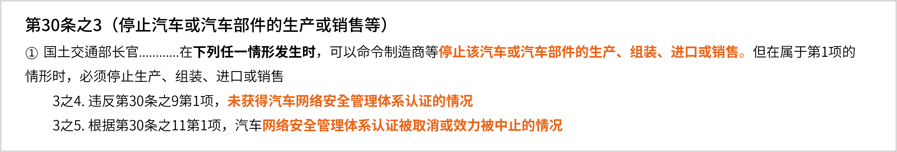 ⦁ 第30条之3规定,没有CSMS认证则不得制造或销售汽车。(第30条之9, 10, 11, 12 规定了关于CSMS的法规)