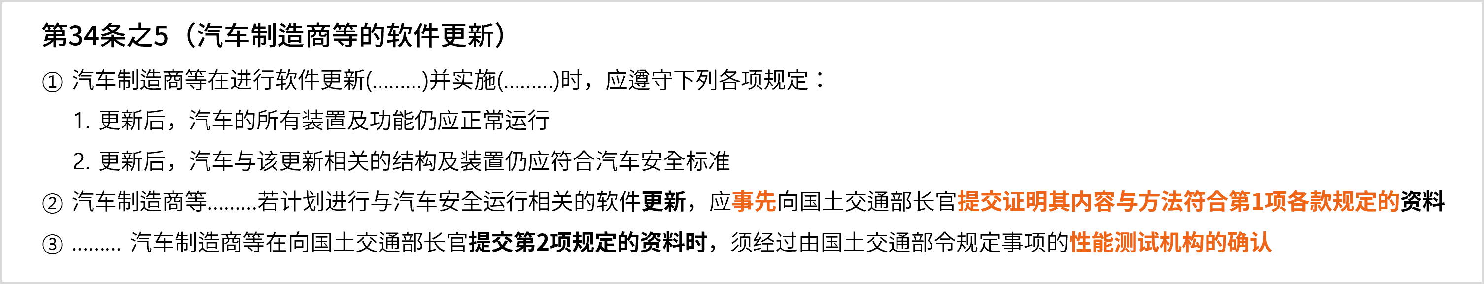 ⦁ 第34条之5规定,更新时必须遵守6项合规事项,必须就涉及汽车安全运行的更新事项事前向国土交通部通报,以及更新需事先通过性能试验代行机构确认:
