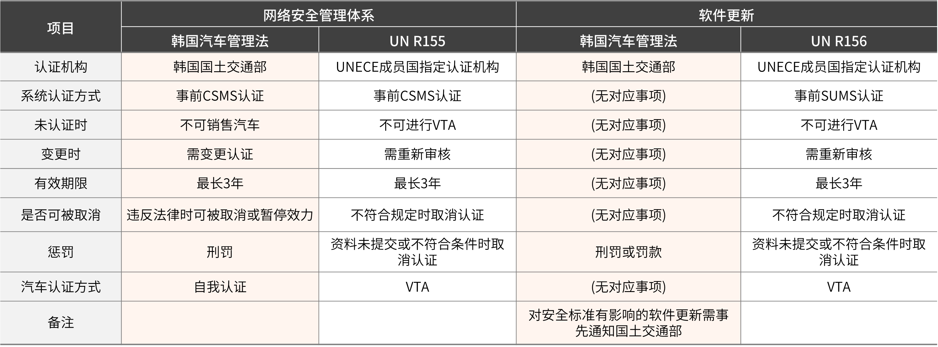 系统认证的有效期最长为3年,获得认证后每年还需进行事后审查。若违反该法规,系统认证可能被撤销。关于违反法规时的处罚:欧法可能导致相关认证被撤销;韩法则根据违规情况可能被处以刑事处罚或行政罚款。最后,车辆认证方法:欧法规定在向UNECE会员国销售汽车前必须获得VTA认证;韩法则通过自我认证即可销售,但若在已售车辆中发现违规事项,可能被命令停止销售。