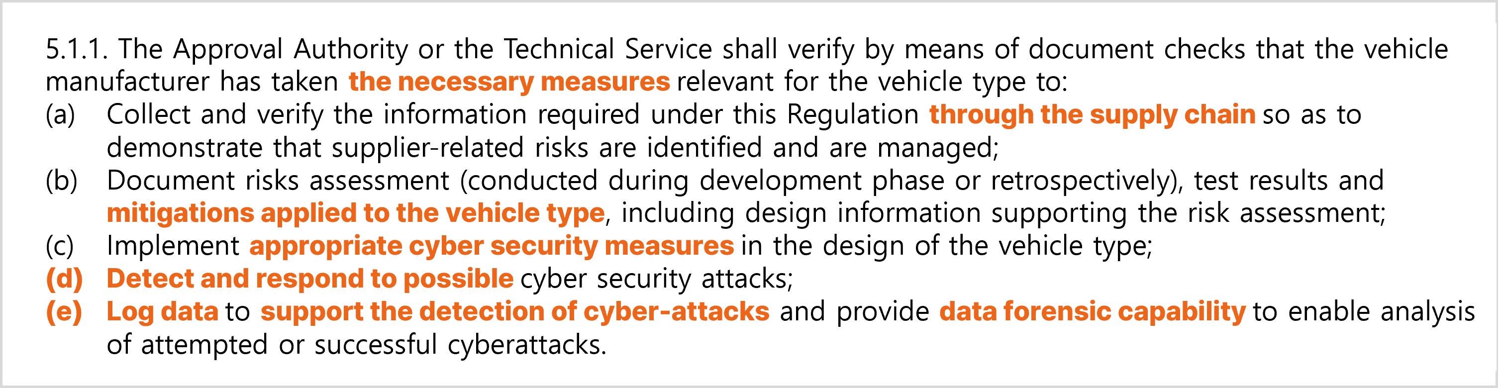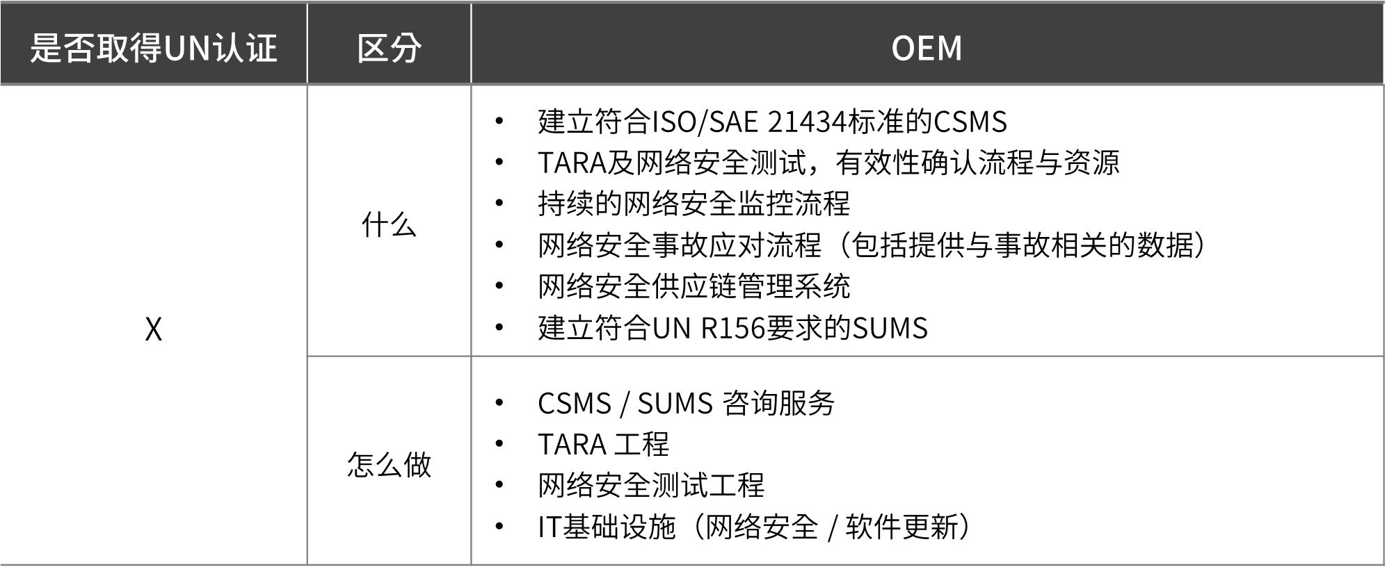UNR155的5.1.1列出了车辆制造商为了获得认证必须在车辆上部署的必要措施: