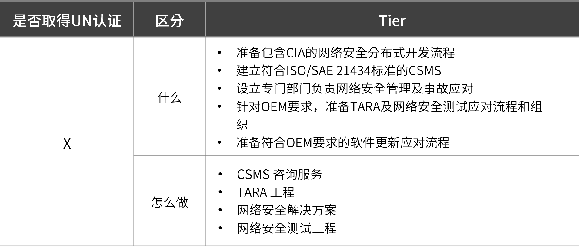 Tier的准备事项也与OEM类似。首先,为应对OEM的CSMS要求,需建立包含CIA要求的网络安全分布式开发流程。主要由营业部门和设计部门负责。并且,需要建立符合ISO/SAE 21434标准的CSMS,并设立负责网络安全管理及事故响应的专门部门或专职团队。最后,为应对OEM的要求,需提前准备执行TARA的流程及资源,以及为实现TARA结果所要求的安全对策,需要提前准备流程和资源,以确保安全技术应用于产品,并为该产品进行安全测试。对Tier供应商而言,重要的是确保应用于所供应控制器的安全技术,并准备保证其质量的安全测试体系。
