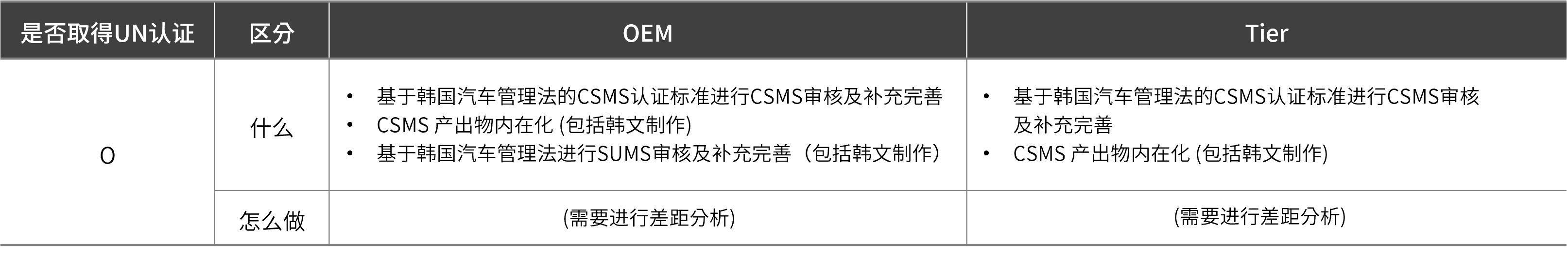 最后,对于已获得UN认证的OEM及Tier供应商,需要基于《韩国汽车管理法》及CSMS认证标准,进行现有CSMS的审查及补充的内化工作。并且,提交给韩国国土交通部的成果必须是韩文版,因此需要对成果进行韩文化处理。