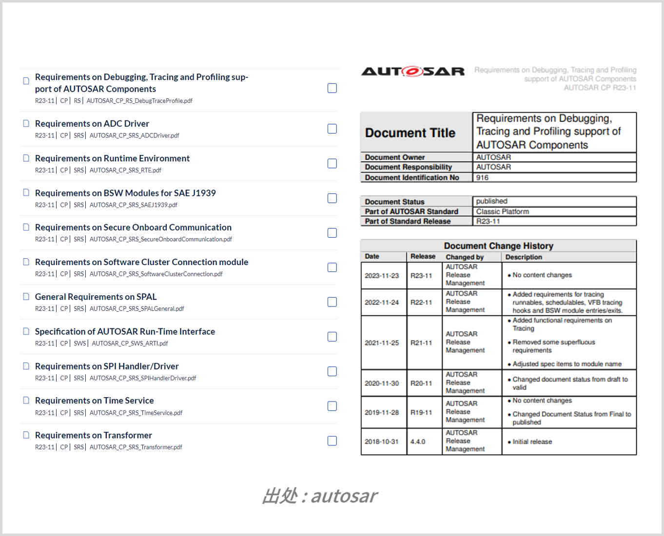 在汽车软件领域,是AUTOSAR主导了这项活动,并且可以说是被使用最多的软件平台,AUTOSAR是于2003年由主要的汽车制造商和控制器制造商共同成立的团体,同时也是被称为Automotive Open System Architecture(开放型汽车标准软件架构)的汽车软件标准。